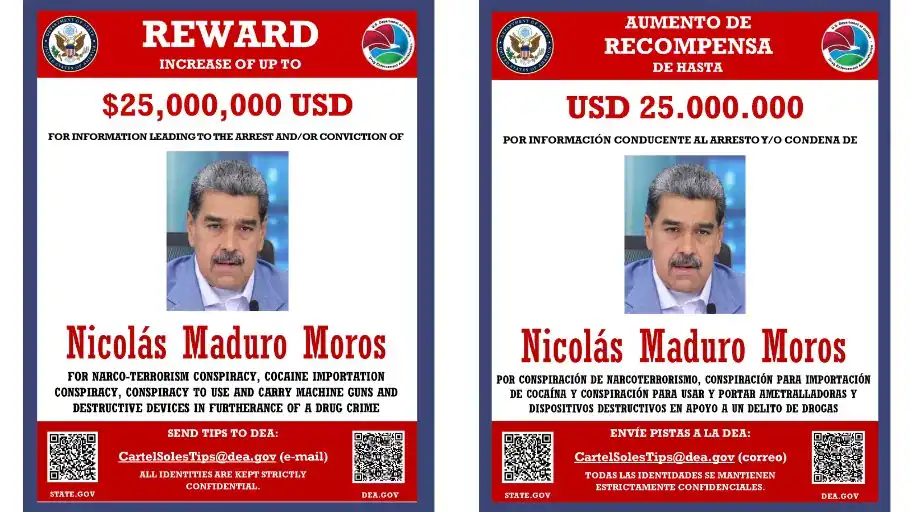 Washington D.C. – La Agencia Antidrogas de Estados Unidos (DEA, por sus siglas en inglés) difundió en julio de 2025 un cartel oficial de recompensas como parte de su Programa de Recompensas por Narcóticos, en el que ofrece hasta 25 millones de dólares por información que conduzca a la captura y condena de Nicolás Maduro Moros y Diosdado Cabello Rondón, y hasta 15 millones de dólares por Vladimir Padrino López.