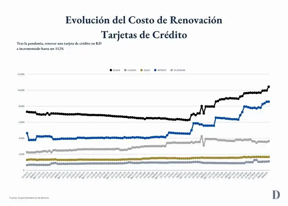 Santo Domingo, República Dominicana. – Entre 2020 y 2025, renovar una tarjeta de crédito en República Dominicana cuesta en promedio un 47% más. Así lo revela un análisis basado en datos históricos del sistema financiero nacional, que refleja cómo los costos de renovación se han disparado tras la pandemia, especialmente en las tarjetas premium.