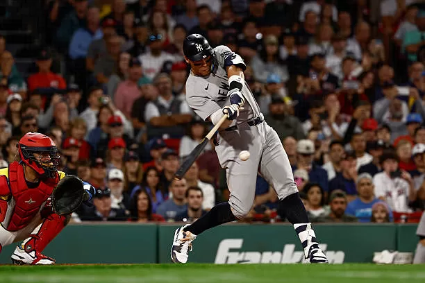 BOSTON, MA – SEPTEMBER 13: Aaron Judge #99 of the New York Yankees hits a single against the Boston Red Sox during the ninth inning at Fenway Park on September 13, 2025 in Boston, Massachusetts. (Photo By Winslow Townson/Getty Images)