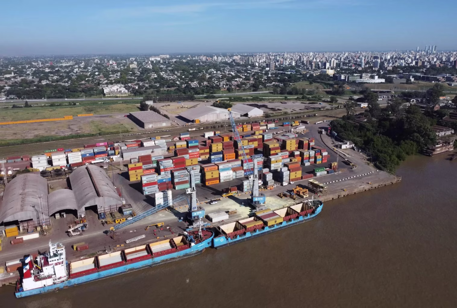 na vista muestra barcos y contenedores de envío en el Puerto de Rosario, en la orilla del río Paraná, provincia de Santa Fe, Argentina 9 de marzo de 2023. REUTERS/Agustin Marcarian