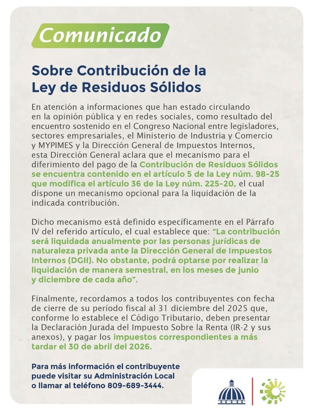 DIARIO FINANCIERO.- La Dirección General de Impuestos Internos (DGII) revirtió el acuerdo alcanzado con gremios empresariales y confirmó que el cobro de la tasa de residuos sólidos se realizará en junio o diciembre, conforme a lo establecido por la ley, en un giro que genera ruido en el entorno económico y cae como un ajuste inesperado en la planificación financiera de empresas y ciudadanos.