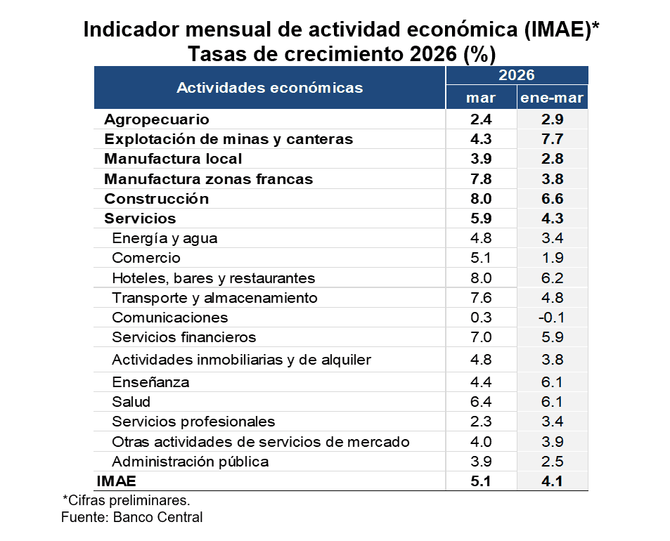 El Banco Central de la República Dominicana señaló que continuará monitoreando el desempeño de la economía dominicana ante el desafiante entorno internacional, marcado por elevados niveles de incertidumbre derivados de tensiones geopolíticas que afectan los mercados globales. En este contexto, la orientación de la política monetaria y las condiciones financieras internas se mantienen alineadas con el objetivo de preservar la estabilidad de precios y la estabilidad macroeconómica. El resultado del IMAE de marzo 2026 consolida al primer trimestre como un período de recuperación productiva sólida, con un crecimiento promedio de 4.1% que posiciona favorablemente a la economía dominicana para afrontar los retos del entorno externo durante el resto del año.