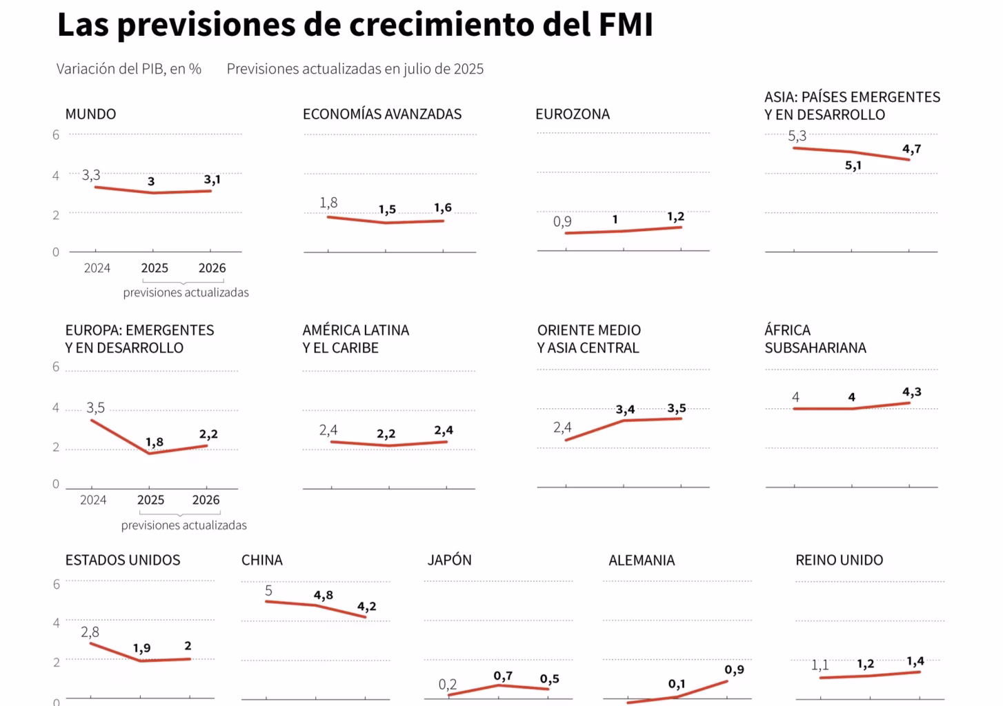 En el caso de las economías emergentes y en desarrollo, el crecimiento proyectado para 2025 es del 4,1%, es decir, 0,4 puntos porcentuales más que en el informe de abril.