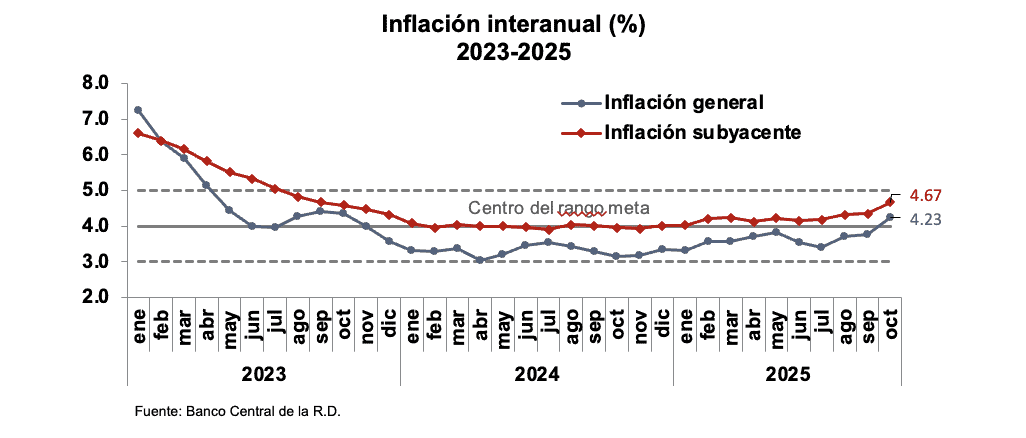 Santo Domingo.– El Banco Central de la República Dominicana (BCRD) informó que el índice de precios al consumidor (IPC) registró una variación mensual de 0.55 % en octubre de 2025, con una inflación interanual de 4.23 % medida de octubre de 2024 a octubre de 2025.