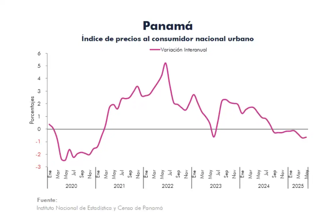 Panamá,– El Instituto Nacional de Estadística y Censo de Panamá reportó que el Índice de Precios al Consumidor (IPC) mostró una variación interanual de -0,7% en mayo de 2025, manteniendo valores negativos por noveno mes consecutivo. El Índice de Precios al Consumidor (IPC) Nacional Urbano de Panamá registró una variación mensual negativa de -0.1% en mayo de 2025 respecto a abril, según datos oficiales publicados con base 2013 = 100. Este comportamiento refleja una tendencia de desaceleración en los precios al consumidor urbano.