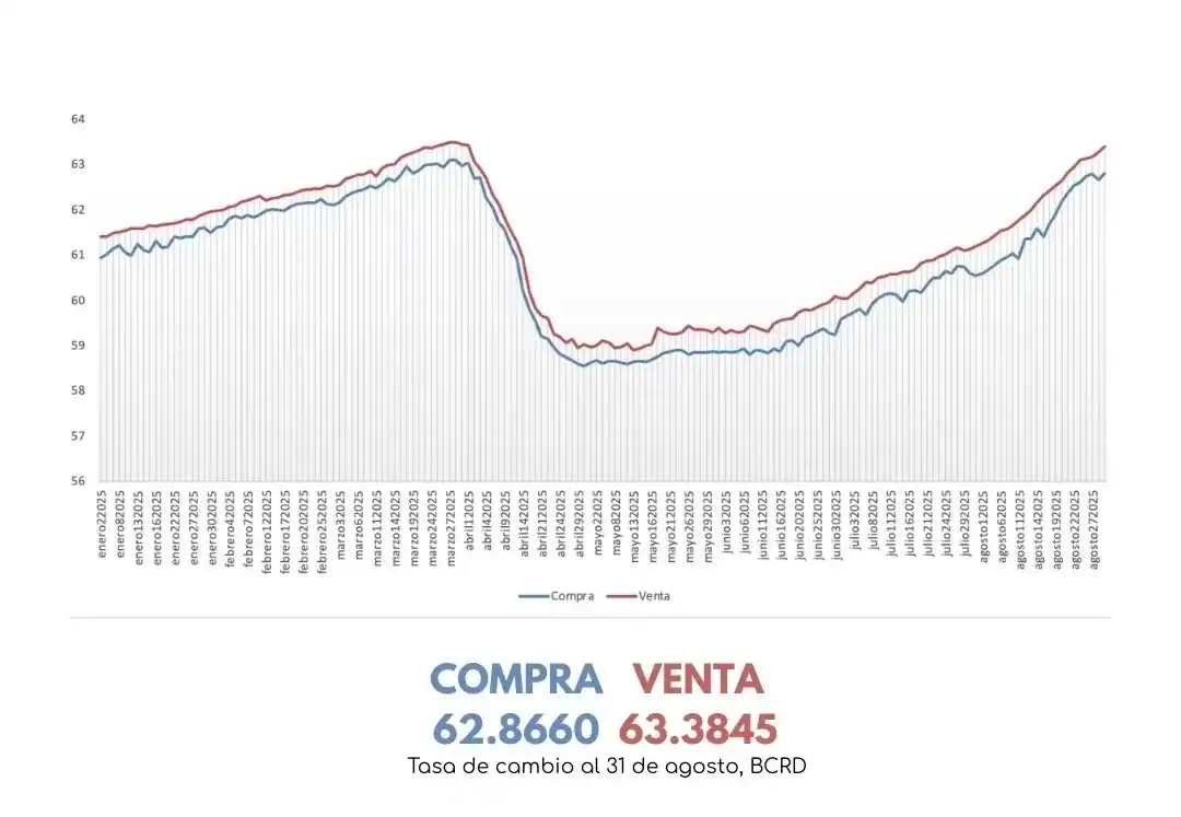 SANTO DOMINGO. – El tipo de cambio en República Dominicana registró una depreciación cercana al 3 % entre enero y agosto, al pasar de 60.93 pesos por dólar en la primera semana de enero a 62.80 en la última jornada de agosto en la tasa de compra.