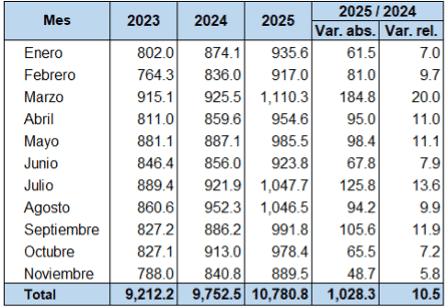 El Banco Central de la República Dominicana (BCRD) informó que entre enero y noviembre de 2025 el país recibió US$10,780.8 millones en remesas familiares, lo que representa un incremento de US$1,028.3 millones, equivalente a un crecimiento interanual de 10.5 %.