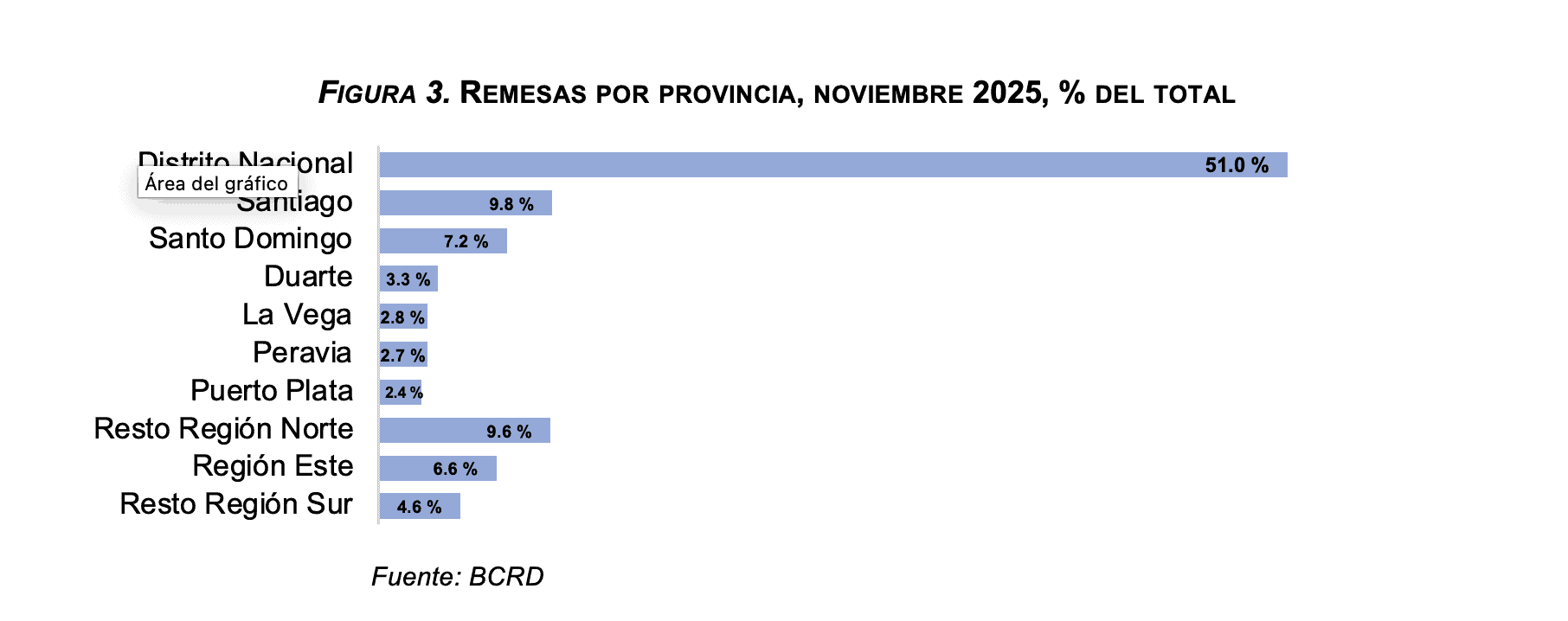 En cuanto a la distribución geográfica interna, el Banco Central señaló que durante noviembre el Distrito Nacional concentró el 51.0 % de las remesas, seguido por Santiago (9.8 %) y la provincia Santo Domingo (7.2 %). En conjunto, las zonas metropolitanas absorbieron el 68.0 % de los flujos recibidos.