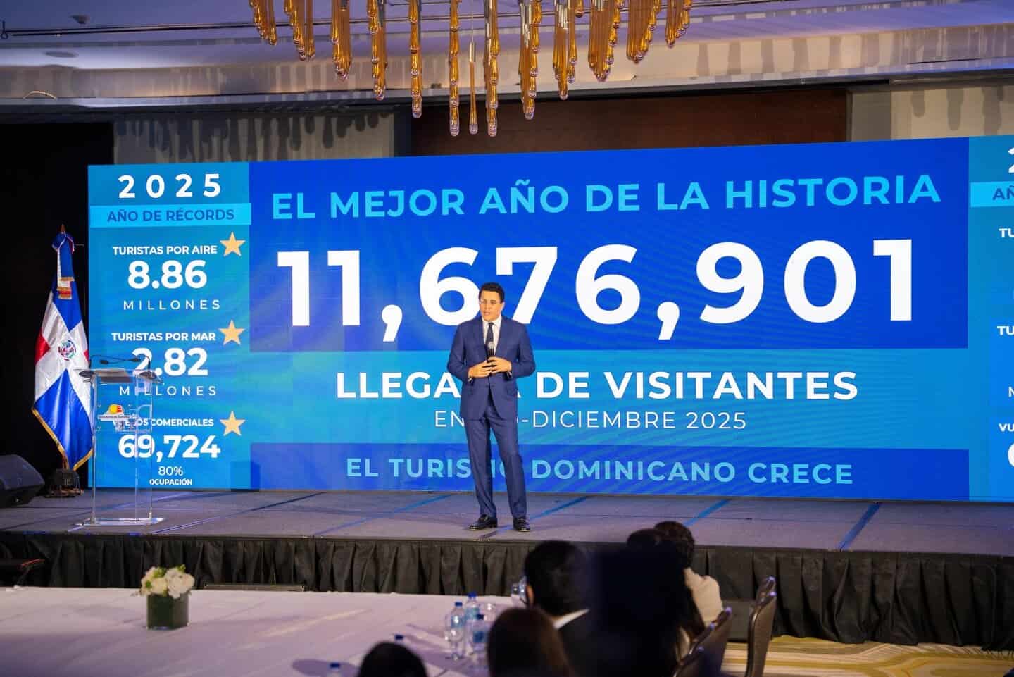 La República Dominicana alcanzó un récord histórico de 11,676,901 visitantes durante el último año, según informó el ministro de Turismo, David Collado, al presentar los resultados del desempeño del sector entre enero y diciembre.