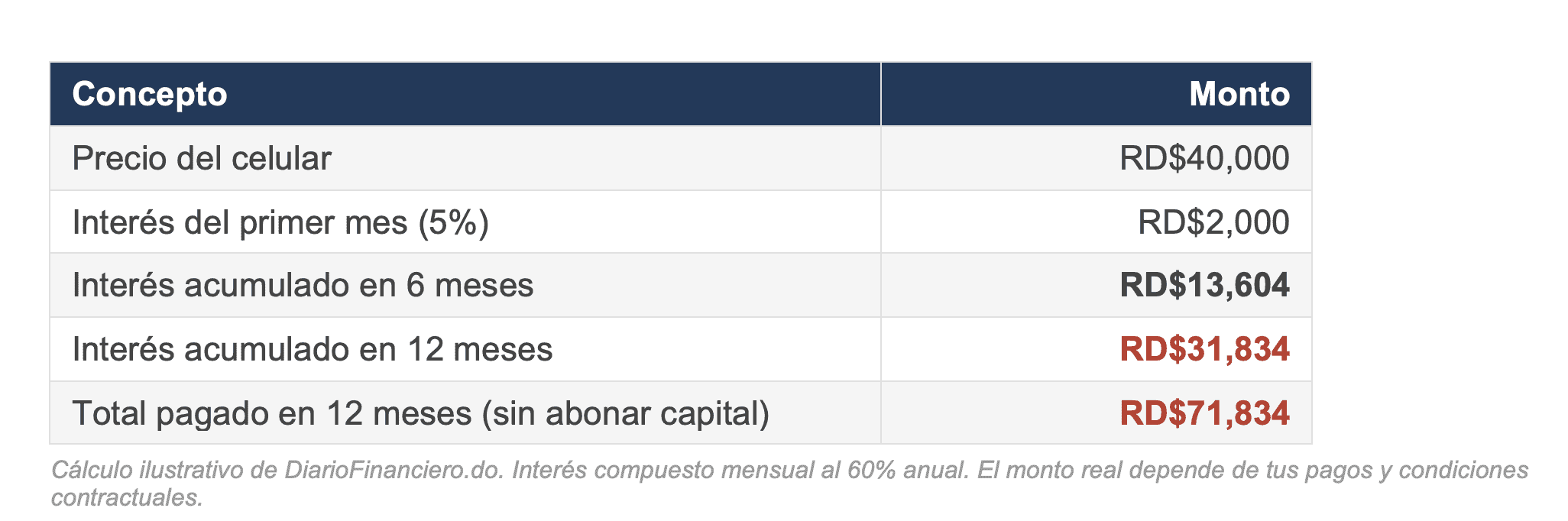 ¿Leíste bien? Si financias un celular de RD$40,000 durante un año pagando solo el mínimo, terminas pagando casi RD$72,000. El celular te costó casi el doble.