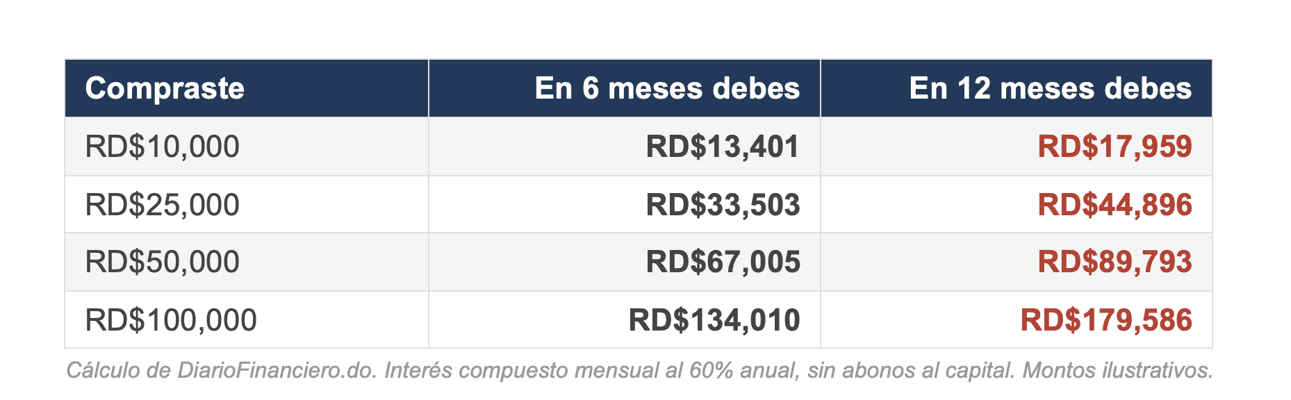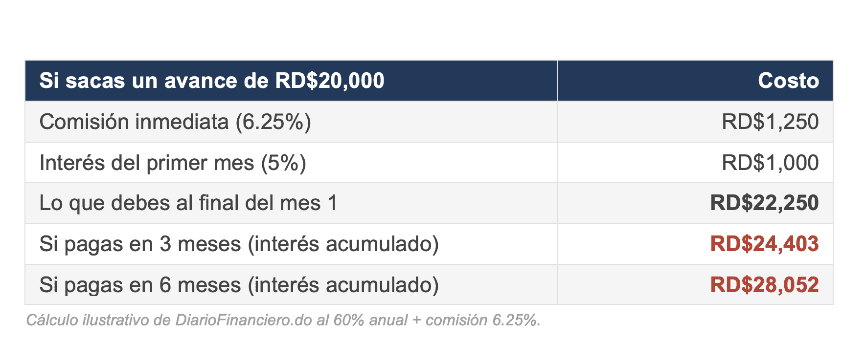 Sacaste RD$20,000. Si tardas 6 meses en pagarlo, devuelves RD$28,052. Pagaste RD$8,052 extra — un 40% más de lo que retiraste.
