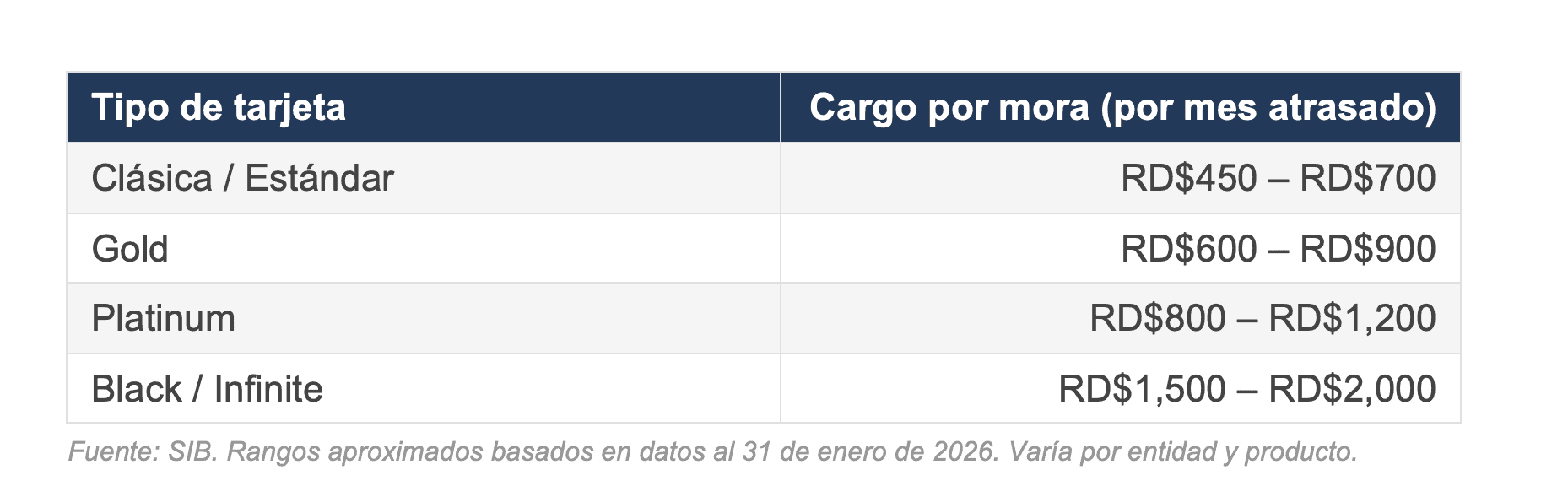 Este análisis fue elaborado por DiarioFinanciero.do con base en los datos de condiciones de tarjetas de crédito publicados por la Superintendencia de Bancos de la República Dominicana (SIB), correspondientes al 31 de enero de 2026. Los cálculos de intereses son estimaciones ilustrativas que aplican interés compuesto mensual sobre la tasa anual reportada. El costo real para cada tarjetahabiente depende de sus condiciones contractuales, el método de cálculo de su entidad y su comportamiento de pago. Se analizaron únicamente tarjetas en pesos dominicanos de entidades activas en el sistema financiero.