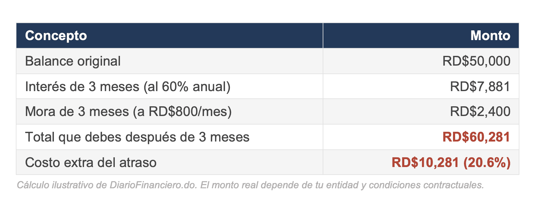 Veamos un ejemplo concreto. Tienes un balance de RD$50,000 y te atrasas 3 meses:
