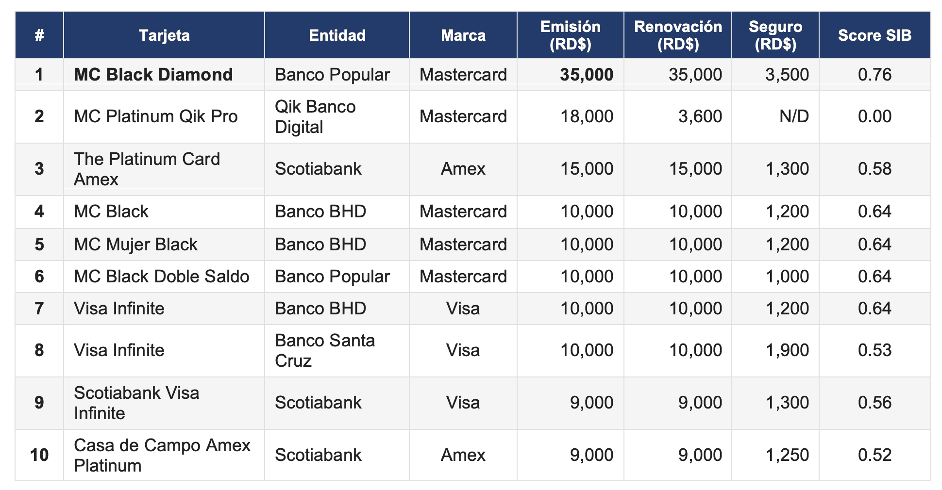 La MC Black Diamond es un caso atípico. Con un costo de emisión de RD$35,000, esta tarjeta de Banco Popular casi duplica a la segunda más cara (RD$18,000) y es 12.6 veces superior al promedio del mercado. Además, su renovación cuesta otros RD$35,000 y su seguro mensual asciende a RD$3,500, lo que la convierte en el producto con mayor costo total recurrente del sistema financiero dominicano.