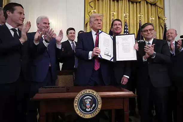 WASHINGTON, DC – JULY 18: U.S. President Donald Trump holds up the “GENIUS Act” alongside applauding lawmakers after signing the bill into law during a ceremony in the East Room of the White House July 18, 2025 in Washington, DC. The act, formally known as the Guiding and Establishing National Innovation for U.S. Stablecoins Act, was passed this week by the U.S. Congress. (Photo by Win McNamee/Getty Images)