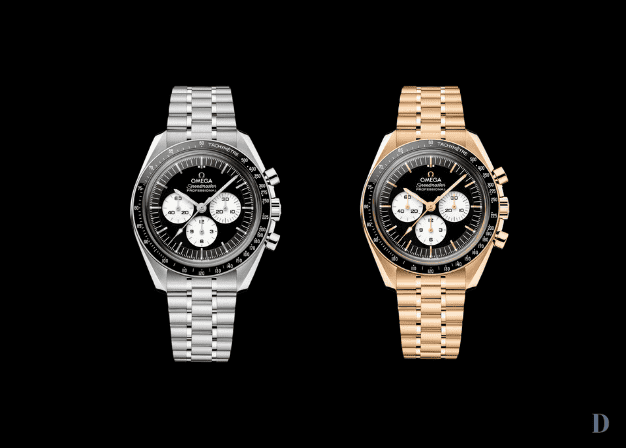 Omega introduce dos versiones claramente diferenciadas. La primera, en acero inoxidable, refuerza el carácter deportivo-clásico del reloj. La segunda, en oro Moonshine Gold de 18 quilates, eleva el producto a un segmento claramente premium, sin romper con la identidad del Speedmaster.