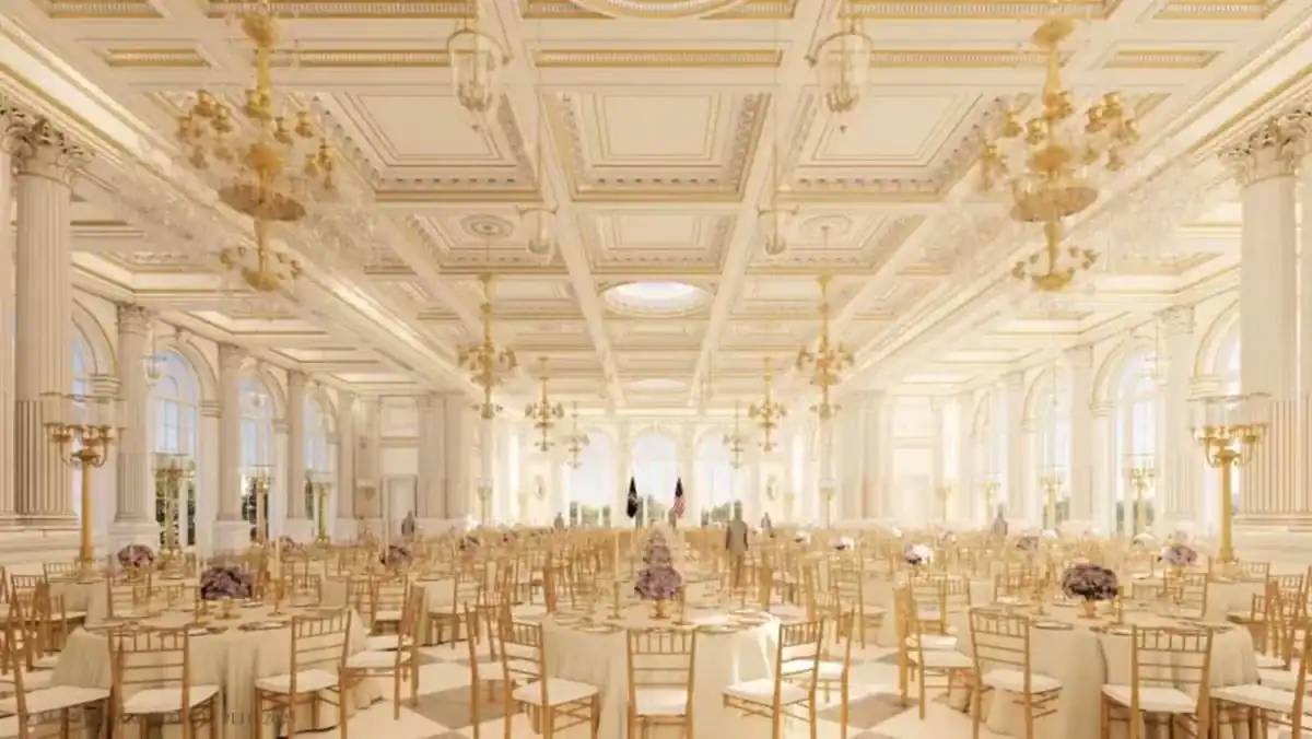 Según los planos divulgados, el nuevo salón combinará decoración clásica con toques dorados, incluyendo candelabros de cristal, columnas corintias y pisos de mármol blanco y negro, inspirados en los clubes de lujo que caracterizan la marca Trump.