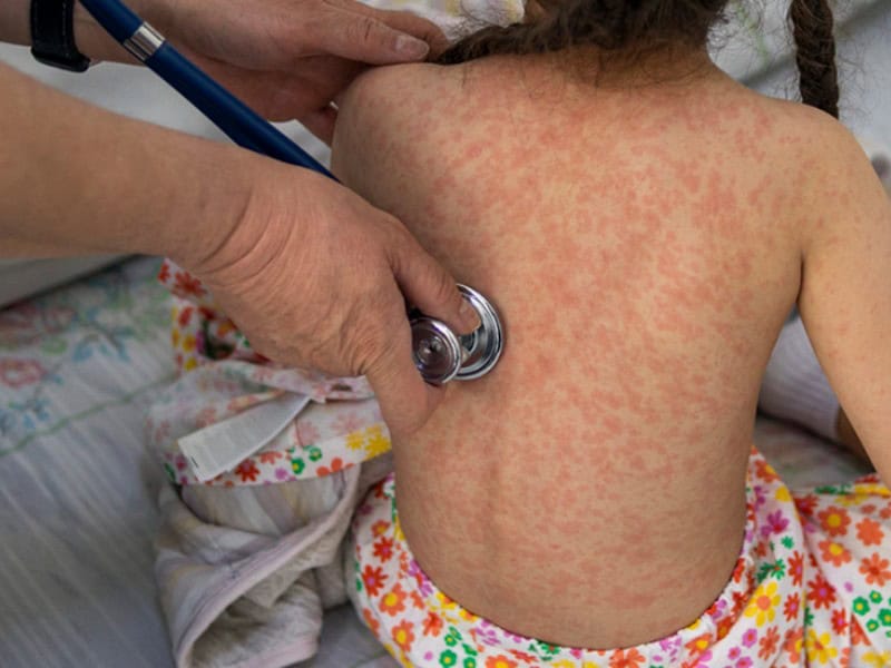 La enfermedad suele causar un sarpullido con manchas rojas, además de otros síntomas como fiebre, dolor de garganta y ojos inflamados. El padecimiento puede complicarse con neumonía o encefalitis, entre otras afecciones.