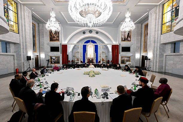 El papa se reunió de paso este sábado con representantes de iglesias y comunidades cristianas en la iglesia siríaca ortodoxa de Mor Efrén.
