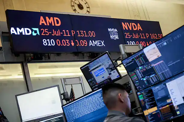 Advanced Micro Devices Inc. and Nvidia Corp. signage on an options contract ticker on the floor of American Stock Exchange (AMEX) at the New York Stock Exchange (NYSE) in New York, US, on Thursday, July 10, 2025. US equities swung between small gains and losses at the open Thursday as investors parsed through a slew of tariff headlines and looked ahead to corporate results that are due to start in the earnest next week. Photographer: Michael Nagle/Bloomberg via Getty Images