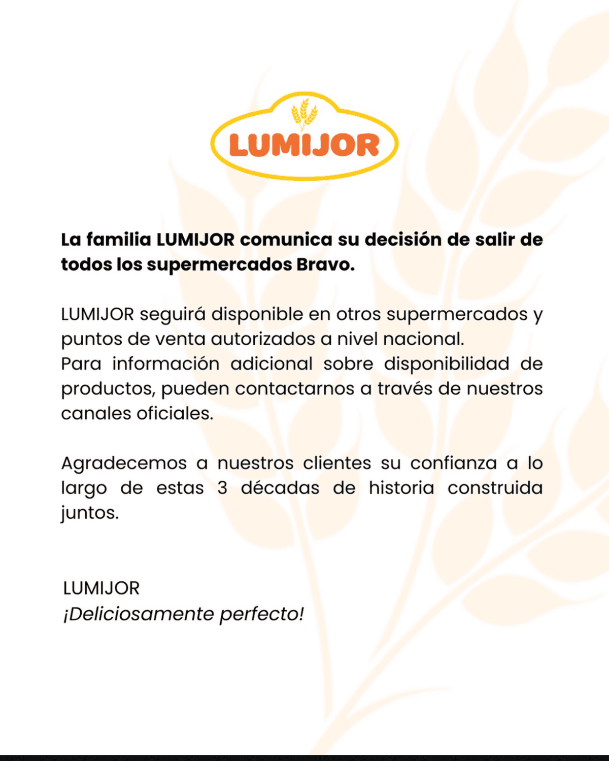 A finales de febrero, la empresa panificadora Lumijor anunció que retiraría todos sus productos de las sucursales de Supermercados Bravo, aclarando que la decisión no afectaría su presencia en otros puntos de venta del país.