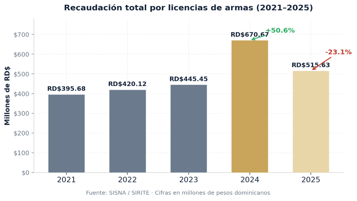 DIARIO FINANCIERO.- El 2024 marcó un punto de inflexión en la recaudación por licencias de armas en República Dominicana. Las medidas adoptadas por el Ministerio de Interior y Policía —centradas en la regularización del parque existente— se tradujeron en un impacto de recaudación inmediato y medible.