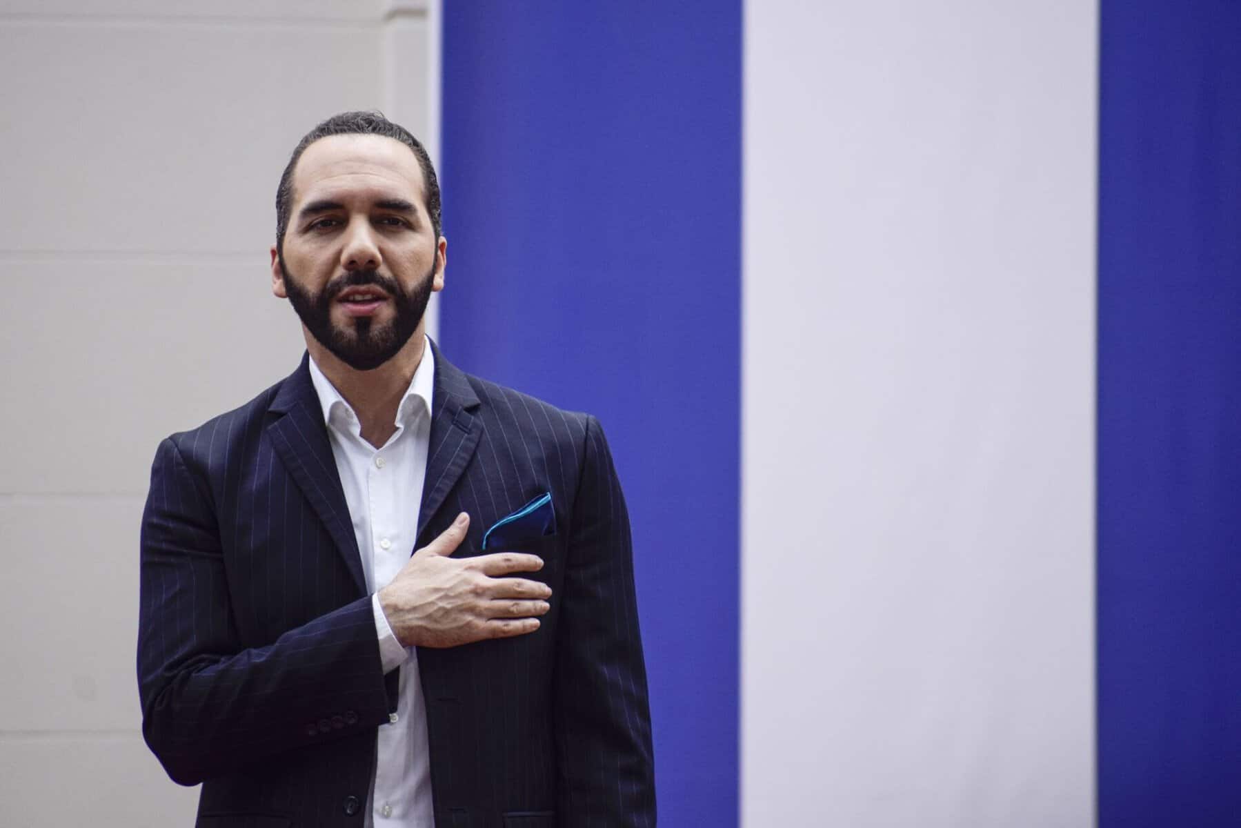 SAN SALVADOR, EL SALVADOR - MAY 06: President of El Salvador Nayib Bukele gestures during a Latin-American tour for migration development on May 6, 2022 in San Salvador, El Salvador. (Photo by Kellys Portillo/APHOTOGRAFIA/Getty Images)