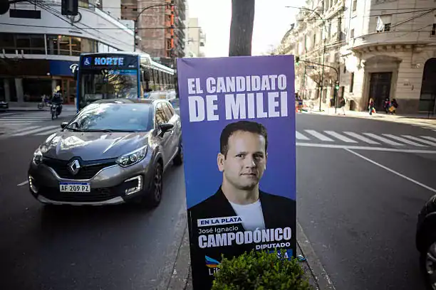 Campaign signage for the La Libertad Avanza party in La Plata, Buenos Aires province, Argentina, on Thursday, Sept. 4, 2025. The upcoming vote in Buenos Aires province is seen by investors as a key signal of what's to come in October, when all of Argentina heads to the polls to renew a large chunk of Congress. Photographer: Tomas Cuesta/Bloomberg via Getty Images