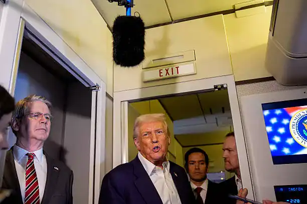 IN FLIGHT - OCTOBER 27: U.S. President Donald Trump, accompanied by U.S. Secretary of State Marco Rubio, (2nd R), U.S. Treasury Secretary Scott Bessent (L), and U.S. Trade Representative Jamieson Greer (R), speaks to members of the media aboard Air Force One on October 27, 2025, in flight. Trump is in route to Japan after attending the Association of Southeast Asian Nations (ASEAN) summit in Malaysia, and will travel on to South Korea for the Asia-Pacific Economic Cooperation (APEC) forum. (Photo by Andrew Harnik/Getty Images)