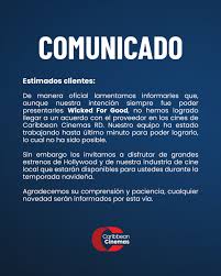 El comunicado indica que trabajaron hasta último momento para asegurar la cinta en el país, pero las negociaciones no avanzaron. Debido a esto, todos los complejos de Caribbean Cinemas quedaron sin funciones de Wicked For Good en República Dominicana.