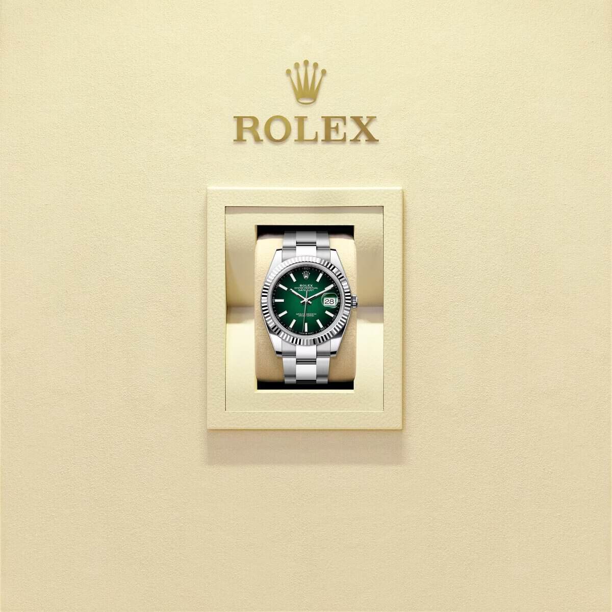 La caja de 41 mm en arquitectura Oyster —carrura monobloque, fondo enroscado y corona de doble hermeticidad Twinlock— garantiza una impermeabilidad de 100 metros sin sacrificar un ápice de elegancia. El bisel estriado en oro blanco, seña de identidad del Datejust desde sus orígenes, enmarca el cristal de zafiro con lente Cyclops sobre la ventana de fecha: un detalle funcional elevado a gesto de diseño. La corona Twinlock asegura el hermetismo sin comprometer la facilidad de uso, evidenciando cómo Rolex resuelve con elegancia tensiones que en otras marcas son concesiones.
